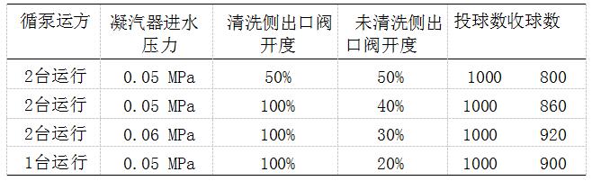 通過表2可看出,隨著循泵運行臺數(shù)增加,凝汽器的進口壓力升高,進、出口差壓增大,收球率大大提高。
