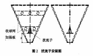 3)經(jīng)過與廠家協(xié)商,為克服循環(huán)水出口壓力偏高造成的膠球在收球網(wǎng)內(nèi)的強(qiáng)烈旋轉(zhuǎn),如圖2所示,在膠球清洗裝置內(nèi)部加裝擾流子,要求擾流子材質(zhì)為Q235,擾流子和收球網(wǎng)加強(qiáng)板要可靠地焊接。以降低凝汽器循環(huán)水出口的壓力及膠球在收球網(wǎng)內(nèi)部的旋轉(zhuǎn)強(qiáng)度,從而使膠球順利地落入收球網(wǎng)底部,及時(shí)送人收球泵人口管道。