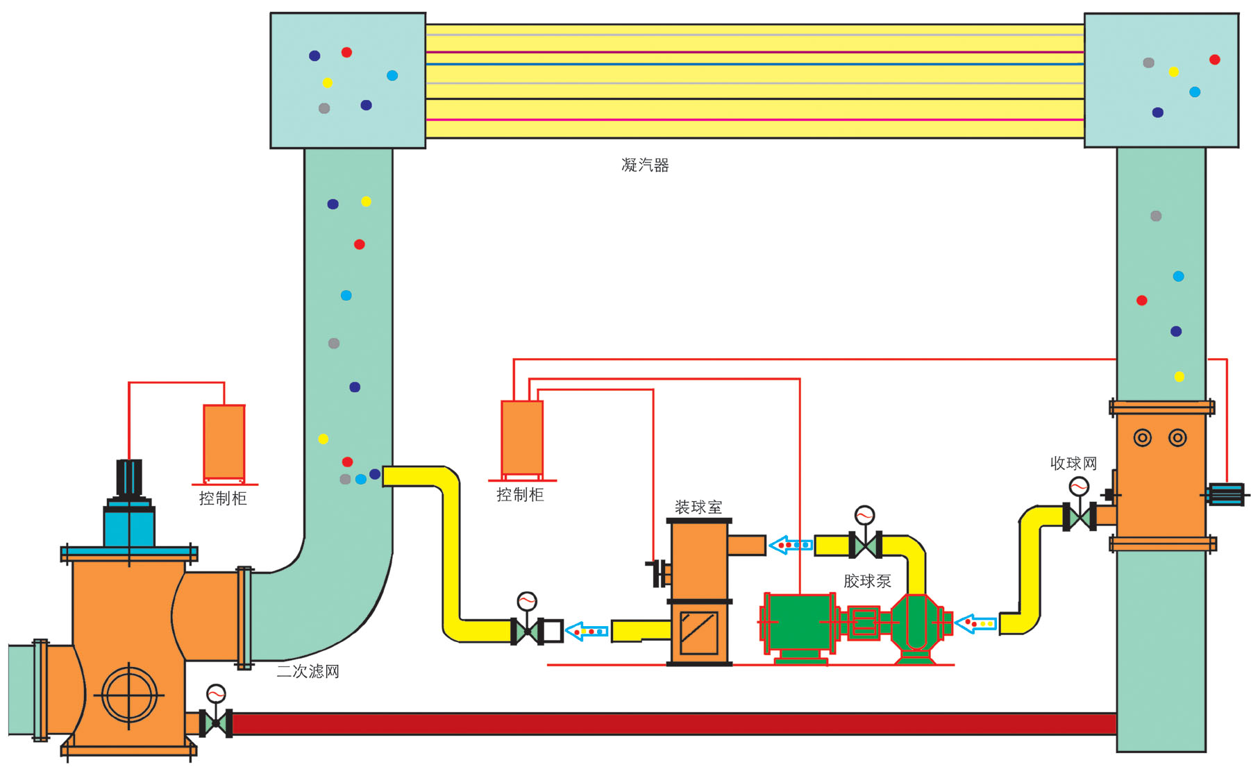 我公司生產的凝汽器膠球清洗裝置,適用于50~600MW汽輪機發電機組,膠球清洗裝置主要由膠球泵、收球網、裝球室、電控柜以及附屬件等設備組成。其工作原理是:膠球泵啟動,借助水流的作用將直徑大于冷凝管內徑的海綿膠球擠進凝汽器冷凝管,經收球網收球再進入裝球室。通過這一過程,膠球對冷凝管進行清洗,維持冷凝管內壁清潔,保證凝汽器設計換熱效率不下降,從而維持凝汽器的端差和汽輪機背壓;同時避免冷凝管內壁腐蝕,改善運行條件,延長機組壽命。