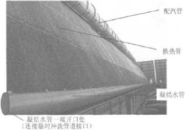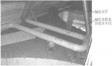 凝結水收集管的清理。凝結水收集管用于匯集各個換熱單元冷凝下來的凝結水,并引流至熱井,管徑一般較小。這段管道水平段較多,1臺600MW機組空冷系統(tǒng)凝結水收集管水平管(dl68mm,圖7)累計長達約960m,現(xiàn)在的冷態(tài)沖洗因沖洗水流量太小無法達到,所以特別建議對凝結水收集管進行單獨且大流量沖洗,仍然用沖洗凝結水管時安裝的臨時沖洗管道,將原先的凝結水管沖洗出口端封閉,打開凝結水收集管的進水閥門,將收集管上的排污法蘭打開,用高速水流將收集管內(nèi)部的污物沖出系統(tǒng),從凝結水收集總管處的排污法蘭處排放。沖洗至出水清澈、無大顆粒雜質(zhì)為止。然后關閉排污法蘭,仍用臨時沖洗水對凝結水收集管及熱井進行沖洗,將雜質(zhì)沖到熱井,后清理熱井。人工清理熱井時,可以先進行掃除,然后用海綿將泥水吸凈,后,用面團粘除細小的機械微粒。此外,建議凝結水收集管在安裝時整體呈一定的斜率,向下連接至熱井。