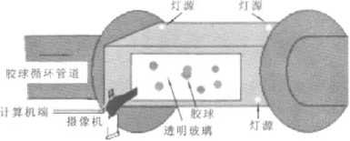 自動(dòng)監(jiān)測(cè)系統(tǒng)示意圖如圖1所示。該系統(tǒng)可以自動(dòng)地監(jiān)測(cè)回收膠球的數(shù)量及其半徑,這樣運(yùn)行人員就可以根據(jù)檢測(cè)結(jié)果適時(shí)地添加或更換膠球,保證膠球的數(shù)量以及質(zhì)量,以期達(dá)到佳的清洗效果。通過(guò)多次試驗(yàn),攝像機(jī)的佳有效位置及其范圍得以確定,并根據(jù)強(qiáng)度承受力和光照特點(diǎn)選擇了合適的材料。本系統(tǒng)硬件配置如圖2所示,其中透明管道材料為鑄造鋼、光學(xué)玻璃,管道內(nèi)側(cè)不同角度裝有頻閃燈,攝像機(jī)拍攝角度垂直于密封玻璃面,拍攝焦距可調(diào)。