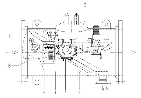 1收球器殼體;6收球網(wǎng)觀察孔;7驅(qū)動機構(gòu);3導(dǎo)流板N出球管管口;4軸承+/-壓差測量系統(tǒng)接口;5網(wǎng)板半橢圓形收球網(wǎng);5將膠球引至出球管管口N。