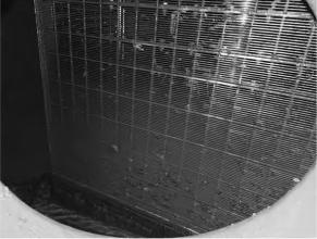 由于長江下游汛期水草雜物多,若循環水旋轉濾網網板間間隙較大會導致雜物覆蓋收球網,嚴重時會導致收球網變形甚至軸承抱死,收球網無法開啟和關閉到位,從而導致收球率較低。如圖3、4所示,某電廠收球網變形后會導致收球網網板關閉不嚴,在收球的過程中,膠球不僅會通過收球網網板間的間隙漏出,還會通過收球網與循環水管壁的間隙漏出,導致收球率較低。