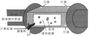 自動(dòng)監(jiān)測(cè)系統(tǒng)示意圖如圖1所示。該系統(tǒng)可以自動(dòng)地監(jiān)測(cè)回收膠球的數(shù)量及其半徑,這樣運(yùn)行人員就可以根據(jù)檢測(cè)結(jié)果適時(shí)地添加或更換膠球,保證膠球的數(shù)量以及質(zhì)量,以期達(dá)到佳的清洗效果。通過(guò)多次試驗(yàn),攝像機(jī)的佳有效位置及其范圍得以確定,并根據(jù)強(qiáng)度承受力和光照特點(diǎn)選擇了合適的材料。本系統(tǒng)硬件配置如圖2所示,其中透明管道材料為鑄造鋼、光學(xué)玻璃,管道內(nèi)側(cè)不同角度裝有頻閃燈,攝像機(jī)拍攝角度垂直于密封玻璃面,拍攝焦距可調(diào)。