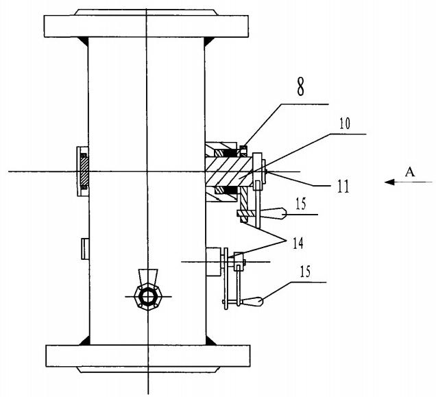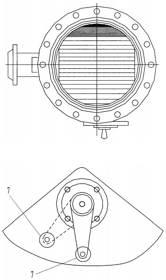 膠球清洗裝置參見圖1,圖1是實施例的主視圖,包括:安裝在主體1側(cè)壁上的柵板轉(zhuǎn)動裝置31和柵板鎖緊裝置32和安裝在主體1內(nèi)的柵板2。柵板2的示意圖可參見該設(shè)備的俯視圖圖3,圖2為實施例中設(shè)備的左視圖,柵板轉(zhuǎn)動裝置31包括:通過螺栓8固定在主體1側(cè)壁上的定位板14,定位板14的通孔中安裝有軸10,手柄15通過螺絲11固定在軸10上,當手柄15轉(zhuǎn)動時,帶動軸10旋轉(zhuǎn),軸10帶動主體1內(nèi)的柵板閉合或開啟,如圖3所示。